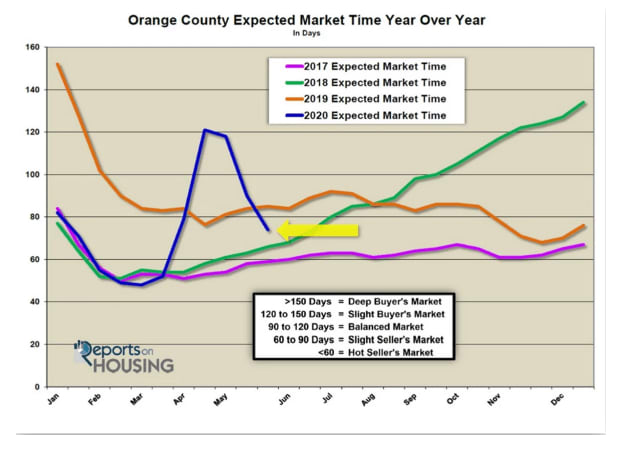 In mid-April, the Expected Market Time (the amount of time from hammering in the for sale sign to opening escrow) was at 121 days, a slight Buyer’s Market (between 120 and 150 days). Since then, it has dropped by 39% and now the Expected Market Time sits at 74 days, a slight Seller’s Market (between 60 and 90 days), totally unexpected. On average, in the past five years, it has increased by 8 days in the same time period. Last year, the Expected Market Time was at 85 days, slower than today.